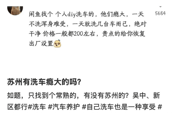 你以为中年男的洗车,是把车开进自动洗衣房,对方拿水枪五分钟结束战斗,但实际上,一群中年男的早就把洗车玩成了冥想。“是那种自己拎着水桶,拎着两桶化学药剂、蹲在轮毂前面刷半小时的洗法。外人看了觉得有病,他们自己知道,这叫修行。”
