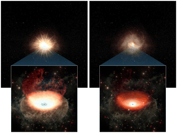 据IT之家了解,绝大多数星系的中心都存在一个超大质量黑洞,其质量可达太阳的数亿倍。在部分情况下,黑洞强大的引力会将周围气体向内牵引。气体在向黑洞螺旋靠近的过程中,会形成一种被称为吸积盘的结构。吸积盘内的摩擦作用将气体加热至极高温度,释放出巨大能量,使得星系核心区域异常明亮(图 2 左)。这类高亮度区域被称作活动星系核(AGN)。