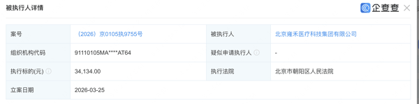 4月1日,植发第一股 雍禾医疗 (02279)的全资子公司北京 雍禾医疗 科技集团有限公司(下称“北京雍禾”)新增一则被执行人信息,执行法院为北京市朝阳区人民法院,立案时间为3月25日,执行标的34134元。