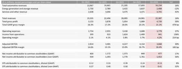 美东时间周三(4月22日)盘后, 特斯拉 发布了2026年一季度财报。数据显示,公司当期营收为223.87亿美元,同比增长16%,创下自2023年第二季度以来最高同比增速。或受此消息影响, 特斯拉 股价在盘后交易中一度上涨近4%。但随后, 特斯拉 盘后时段股价转为下跌0.29%。