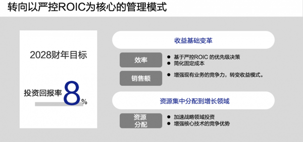 第一阶段是 长期企业愿景 落地的关键开局, “ 转型 ” 成为 核心关键词 。 截至目前,爱普生的业务结构高度依赖成熟市场,在第一阶段,爱普生将直面此前资源配置、资本效率等挑战,转型盈利基础,并将资源重点投向增长领域。以ROIC为核心管理指标, 爱普生力争在 2028 财年实现 8% 的投资回报率目标,为可持续增长奠定坚实基础。