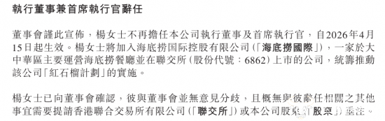 此外,公告中还提到,杨利娟将加入海底捞国际控股有限公司,统筹推动公司“红石榴计划”的实施。