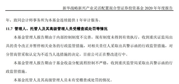 时间再往前追溯,2020年,因内控制度不完善、现有制度未得到有效执行,新华基金被重庆证监局责令整改并暂停相关业务开展,相关责任人员同步被出具警示函。2021 年,公司再收监管罚单,彼时同样以完成整改收尾。
