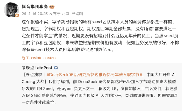 4月16日晚,抖音集团副总裁李亮在社交平台发文表示,“这个报道不实,字节跳动招聘的所有Seed团队技术人员的薪资体系都是一样的,包括现金、字节期权和豆包期权,期权是四年期全部归属,没有所谓‘需要满足一定条件才能拿全’的情况,近期更没有招聘到什么近亿元年薪的员工。当然Seed员工的字节和豆包期权,未来收益根据期权价格有波动,假如业务发展的很好,不排除有些Seed技术人员四年后收益会达到数亿元。”