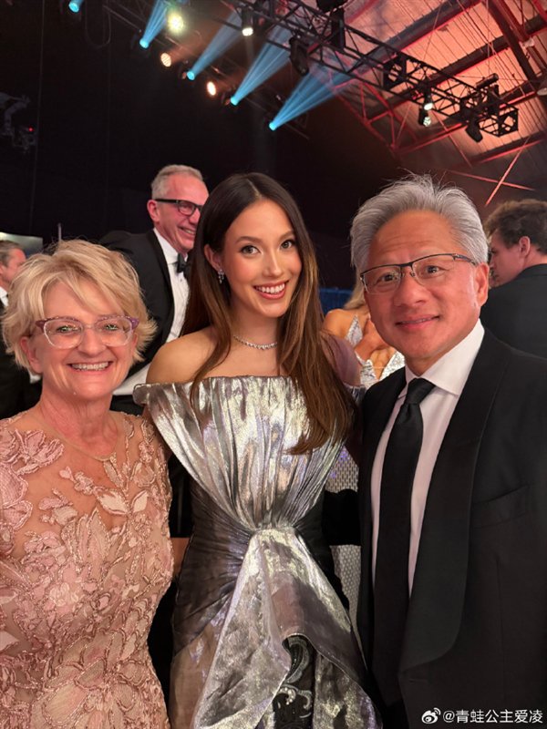 典礼上, 谷爱凌身着郭培2026春夏定制礼服亮相,整体造型优雅大气,黄仁勋则选择了正式西装造型,未穿其标志性的皮衣。