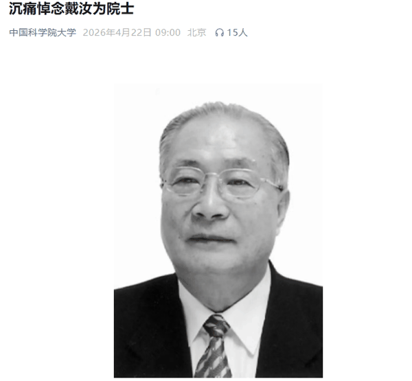 IT之家 4 月 22 日消息,中国科学院院士、中国科学院大学荣誉讲席教授、中国科学院自动化研究所研究员戴汝为同志,因病医治无效,于 2026 年 4 月 19 日 10 时 11 分在北京逝世,享年 94 岁。