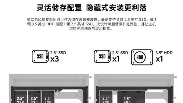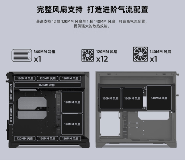 存储方面,机箱提供了 1 个 3.5 英寸硬盘位(可转为 2.5 英寸)和 2 个 2.5 英寸硬盘位。针对发烧友的散热需求,该机箱在多个区域共设计有多达 13 个风扇位,具体包括顶部可安装 3 个 120mm 风扇(支持 240/360 冷排),侧面可安装 2 个 120mm 风扇,底部可安装 3 个 120mm 风扇,后置可安装 2 个 120mm 风扇,电源理线舱内部支架还可安装 2 个 120mm(此处与硬盘位二选一)和 1 个 140mm 风扇。