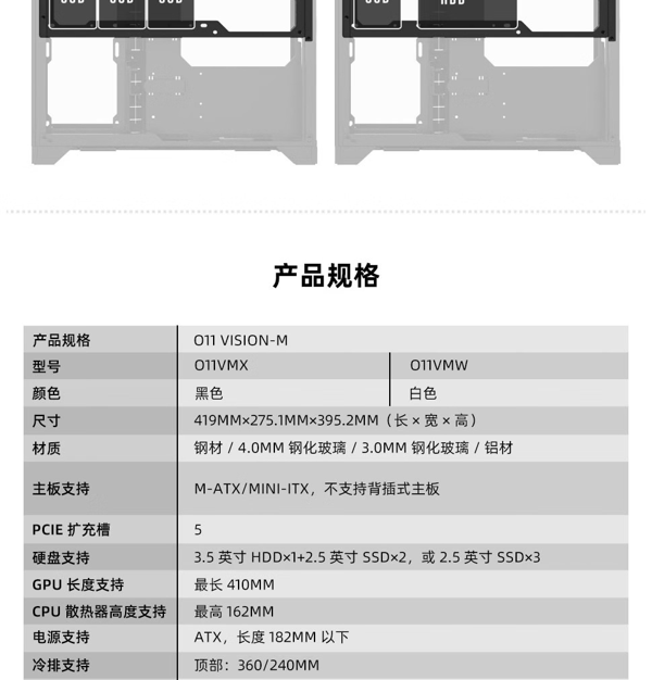 在硬件兼容性与散热规格方面,O11 VISON-M 设有 5 个 PCI 全高扩展槽,CPU 散热器限高 162mm,顶部水冷整体厚度不得超过 55mm,显卡限长达到了 410mm 且附带可调节高度的显卡支架,电源则支持标准 ATX 规格、限长 182mm。