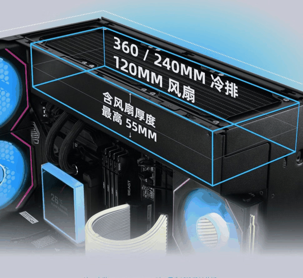 此次,O11 VISON-M 在设计上最具特色的地方在于顶部水冷安装位,联力没有像常规机箱那样将其设置在主板正上方,而是做了偏置处理,从而为尾部预留出双风扇安装位。