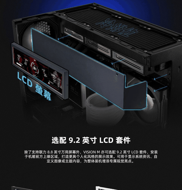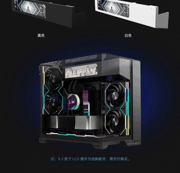 同时,机箱内部加入了可拆式中央分隔板,既可用来遮盖水冷管,也可作为侧面放置 LCD 屏幕的个性化装饰,用户还可选配尺寸更大的联力 9.2 英寸 LCD 屏幕套件进行搭配。
