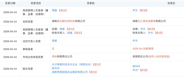 4月27日,据天眼查信息显示 ,近日周媛关联的核心运营主体湖南黑白颠生物科技有限公司完成工商变更,正式更名为湖南优之源咨询管理有限公司,周媛卸任该公司法定代表人、执行董事、经理职务,由尹杰接任,彻底切断与这家企业的直接关联。