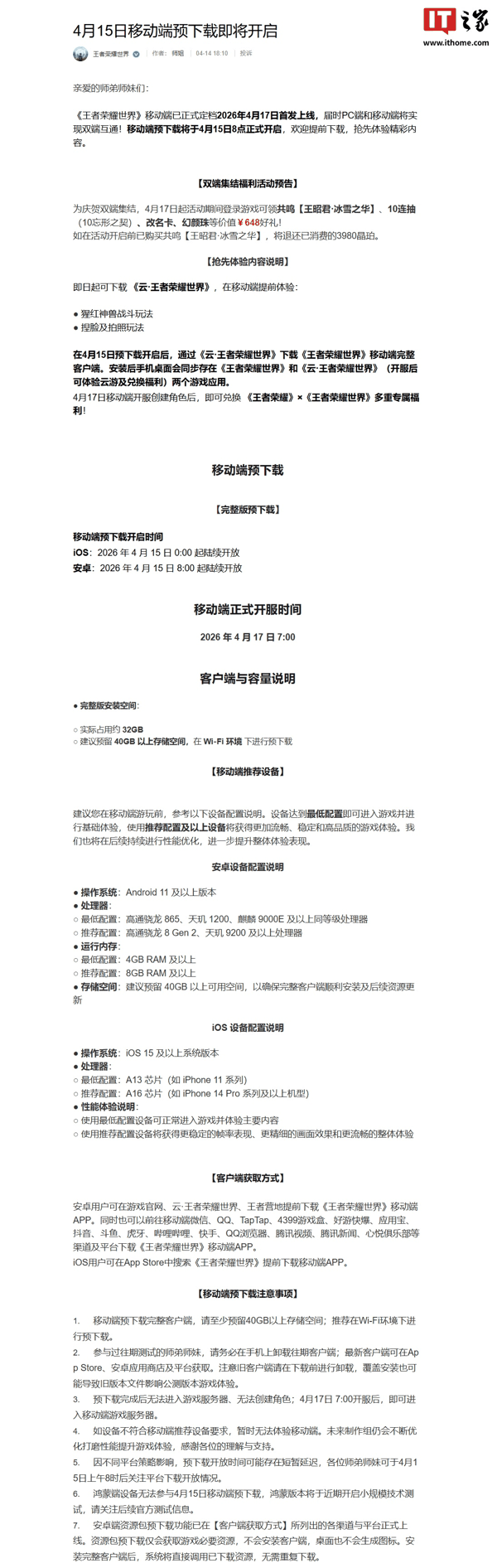 IT之家附《王者荣耀世界》移动端预下载开启时间(游戏开服时间 2026 年 4 月 17 日 7:00):
