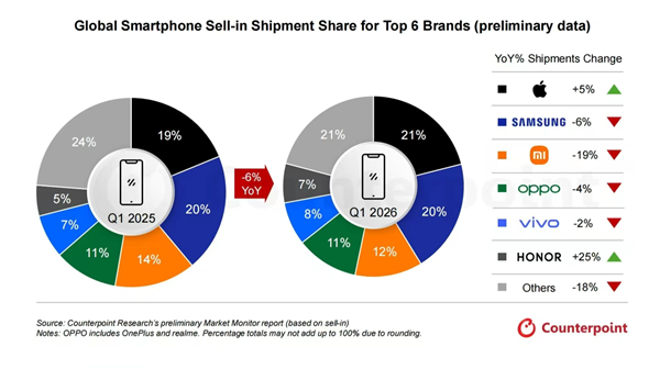 快科技4月15日消息,Counterpoint发布的2026年Q1全球智能手机数据雄安是,市场整体出货量同比下滑6%, 受DRAM与NAND存储芯片短缺、需求疲软及中东局势影响,消费信心低迷。