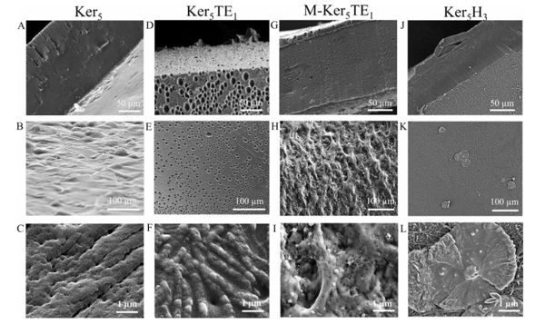其中,一种名为 Ker5 的基础膜仅通过角蛋白自身的相互作用形成,质地致密;另一种 Ker5TE1 则引入了温和的化学交联剂(TEGDMA),增加了内部孔隙率;还有一种 M-Ker5TE1 预先矿化,表面附着了类似骨成分的纳米晶体;最后一种 Ker5H3 则通过更强烈的化学交联(HDI)获得了极高的刚性。