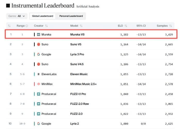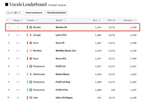 音乐模型: 在国际权威第三方评测Artificial Analysis榜单中,Mureka V8斩获Vocals(人声)与Instrumental(乐器)双项全球榜首,综合表现超越 Suno V5、Google Lyria3 Pro、Minimax Music2.5+等国际主流模型,充分印证了相关技术的全球领先地位。2026年3月推出的Mureka V9进一步强化文本控制与混音能力,推动AI音乐向“精准贴合创作意图”跨越。Mureka API已正式上线。
