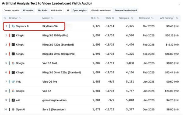 视频模型: 公司于2026年2月推出SkyReels-V4,该模型在Artificial Analysis Text-to-Video(With Audio)与Image to Video(With Audio)两大榜单登顶全球首位,超越Kling3.0、Google Veo3.1、Sora2等全球主流模型。支持音画同出、逻辑推理及多帧参考等高阶能力,已开放API接口。