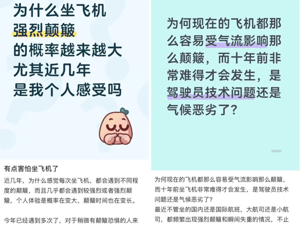 另一位网友写得更具体:“为什么每次坐飞机都会遇到不同程度的颠簸,而且几乎都会遇到较强烈或者强烈颠簸,个人体验是概率在变大,颠簸时间也在变长。今年已经遇到多次了,对于稍微有颠簸恐惧的人来说,现在确实有点害怕坐飞机了。”