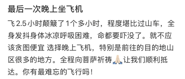 “(这是我)最后一次晚上坐飞机。命都要吓没了!”