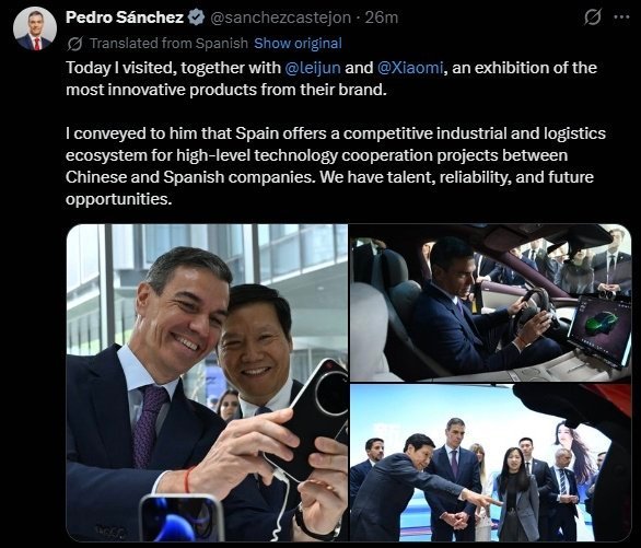 雷军陪同参观小米科技展厅,参观期间,桑切斯详细了解了小米在汽车、手机、智能家居等领域的新产品,并现场体验了小米新SU7、YU7等车型。他现场试用小米17 Ultra手机,给随行记者拍照,并拉上雷军一起自拍。