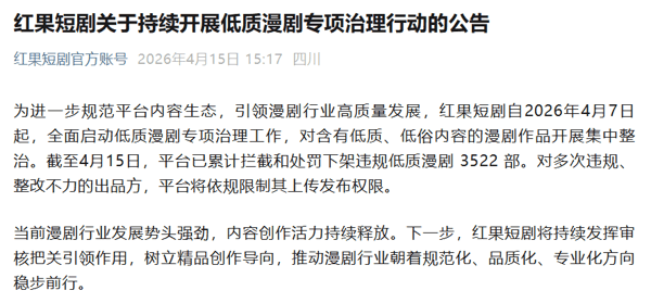 IT之家 4 月 15 日消息,红果短剧官方账号今日发布持续开展低质漫剧专项治理行动的公告。官方表示,2026 年 4 月 7 日起,全面启动低质漫剧专项治理工作。