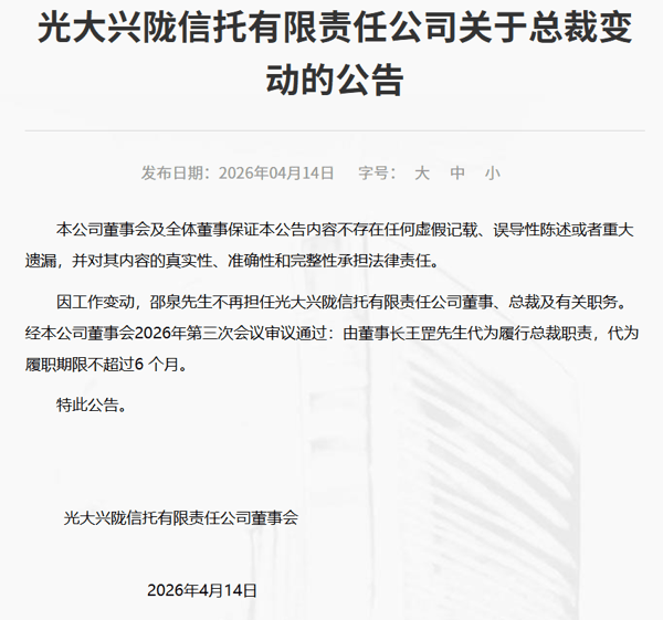 光大 信托 公告称,因工作变动,邵泉不再担任公司董事、总裁及有关职务。经本公司董事会2026年第三次会议审议通过:由 董事长王罡先生代为履行总裁职责 ,代为履职期限不超过6个月。