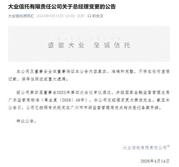 大业信托 则公告总经理变更为黄俊。公告称,经公司第四届董事会2025年第四次会议审议通过,并经国家金融监督管理总局广东监管局核准(粤金复〔2026〕49号), 本公司总经理变更为黄俊 。截至本公告日,公司已按照有关规定在广州市市场监督管理局完成相关登记备案手续。