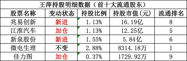 与2025年三季度末相比,王萍对微电生理持股不变,对 江淮汽车 、 佳力图 均有一定加仓。