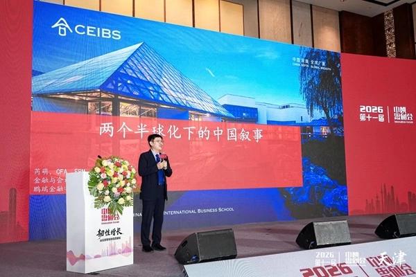 随后,中欧国际工商学院金融与会计学教授、副教务长芮萌以"两个半球化下的中国叙事"为题发表主旨演讲。他援引诺奖得主席勒"叙事经济学"理论,指出经济振兴源于信心,而信心源于认知。