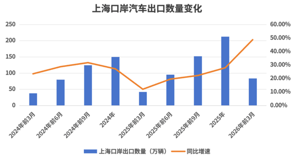 这一数据的含金量在于它表明一季度上海汽车出口实现了“历史性”增长。国产汽车出口从2023年开始放量,当年中国汽车出口首次超越日本,成为全球汽车出口最多的国家。在此之前国内汽车出口规模较小,数据翻倍较为多见。而近年内,上海单季汽车出口增速很少能达到50%。