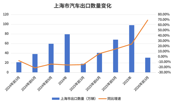 但更加亮眼的数据是汽车出口的增速。一季度,上海关区的汽车出口增速和上海市的汽车出口增速都创下了三年以来的最快纪录。