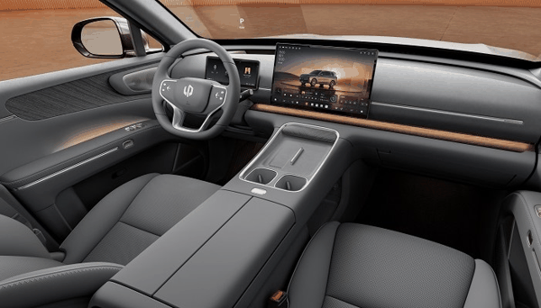 座舱采用当前较常见的简洁布局,配备液晶仪表、悬浮式中控屏和平底双辐方向盘,并使用怀挡机构提升中控区域的空间利用率。车机部分搭载8678芯片,首发风云UI 2.0,支持语音交互和多品牌手机互联。车内采用5座布局,前排配备双零重力座椅,支持较完整的电动调节、通风、加热和按摩功能,后排也提供电动调节、通风和加热,高配车型进一步加入后排吸顶屏和23扬声器音响。
