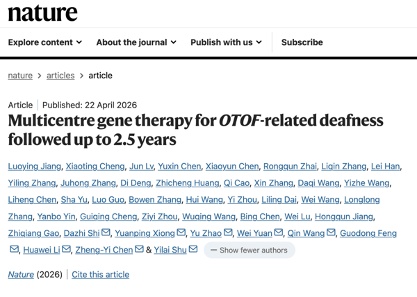 IT之家 4 月 23 日消息,据复旦大学今日消息,北京时间 4 月 22 日晚,复旦大学附属眼耳鼻喉科医院舒易来教授领衔的先天性耳聋基因治疗多中心临床研究在《自然》(Nature)杂志在线发表,这项针对 OTOF 先天性耳聋的基因治疗研究, 发布了长达 2.5 年的结果,还找到了预判治疗效果的核心生物标志物 。