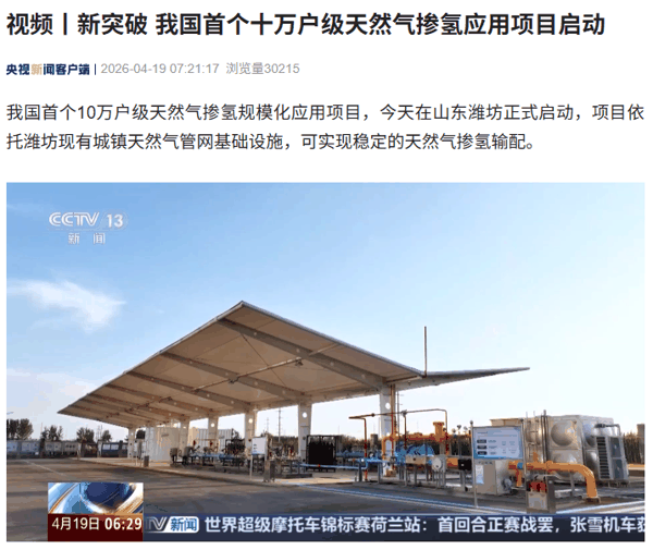 速读:新突破,我国首个十万户级天然气掺氢应用项目在潍坊启动2026年04月19日07:30IT之家IT之家4月19日消息,据央视新闻报道,我国首个10万户级天然气掺氢规模化应用项目,今天在山东潍坊正式启动,项目依托潍坊现有城镇天然气管网基础设施,可实现稳定的天然气掺氢输配。
