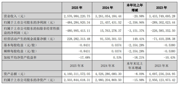 报告显示,2025 年经纬辉开实现营业收入 25.77 亿元,同比下降 20.98%;归属于上市公司股东的净利润为 - 4.84 亿元,同比下降 2356.96%;扣除非经常性损益后的净利润为 - 4.81 亿元,同比下降 3151.37%。经营活动产生的现金流量净额为 2.28 亿元,同比增长 149.41%。截至 2025 年末,经纬辉开资产总额 41.60 亿元,同比下降 8.09%;归属于上市公司股东的净资产 25.04 亿元,同比下降 15.98%。