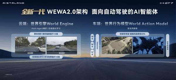 感知硬件方面,启境GT7配备全球量产最高规格896线双光路图像级激光雷达,模组厚度缩减40%、分辨率提升400%,首创双光路架构实现广角纵览与长焦细节成像,显著增强夜间对各类障碍物的识别能力,可稳定探测120米外一罐可乐大小的障碍物。该智驾系统基于WEWA2.0架构打造,结合云端仿真与车端安全风险场,将事故风险再降低50%。