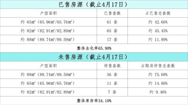 未售房源的结构则进一步印证了这种分化。截至4月17日,项目待售房源中,约89平方米户型待售56套,占期房待售总套数的75.68%;约65平方米户型仅剩余11套待售,占比14.86%;约82平方米户型仅剩余7套待售,占比9.46%。