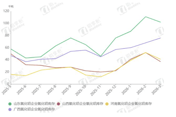 从库存数据对比来看,晋豫两地氧化铝库存持续处于低位,且显著低于沿海的山东、广西地区。 阿拉丁 (ALD)统计数据显示,近期电解铝厂内、氧化铝厂内氧化铝库存均呈现去库态势,但区域分化明显。晋豫两地氧化铝厂内成品库存长期维持低位,截至2026年3月31日,全国氧化铝厂内成品库存仅205.5万吨,其中晋豫两地库存为78万吨,全国占比不足38%。反观山东地区,作为沿海氧化铝主产区,氧化铝库存压力显著较大,截至2026年3月,其氧化铝厂库存就达102万吨,较晋豫两地总和高出24万吨,且山东沿海 青岛港 、 日照港 也有一定的氧化铝库存仍在持续累库,库存消化压力突出。这种差异长期存在,并非短期市场波动所致,恰好是晋豫氧化铝产能核心优势的直接体现。