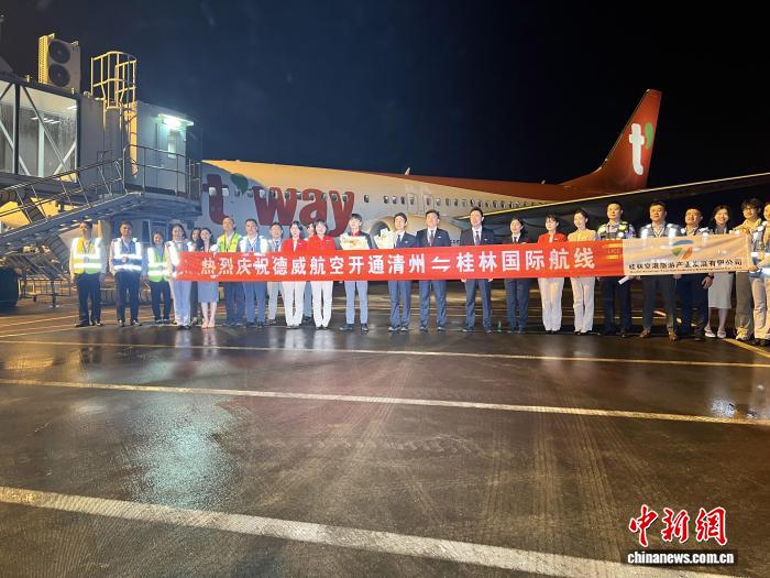 该航班落地桂林机场后,桂林市文旅部门、桂林机场组织了首航仪式。据悉,此次新航线由德威航空采用波音B737-800机型执飞,航班号为TW9613/9614,计划每周飞行两班,周三、周六从清州飞往桂林,周四、周日从桂林返回清州。