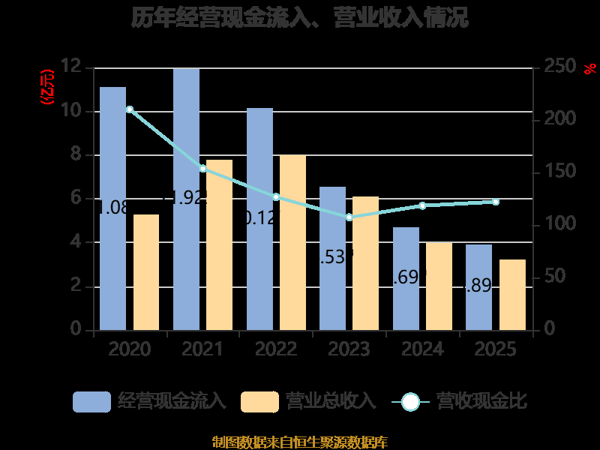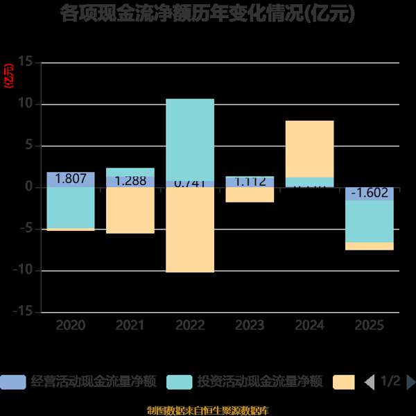 截至2025年,公司经营活动现金流净额为-1.6亿元,同比减少1.72亿元;筹资活动现金流净额-8919.84万元,同比减少7.69亿元;投资活动现金流净额-5.03亿元,上年同期为1.08亿元。