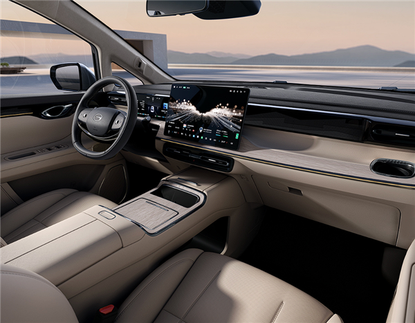 和大多数新能源一样,新车内饰风格也走的是简约科技路线, 全系标配10.25英寸仪表屏与15.6英寸悬浮式中控屏、电子怀档杆,并采用2+2+3的七座布局,其中二排座椅配备通风、加热和按摩功能,还提供小桌板、三温冰箱与17.3英寸后排娱乐屏可选装 。