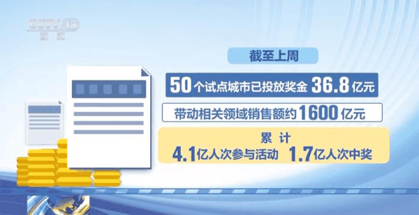 截至上周,50个试点城市已投放奖金36.8亿元,带动相关领域销售额约1600亿元,累计4.1亿人次参与活动,1.7亿人次中奖。