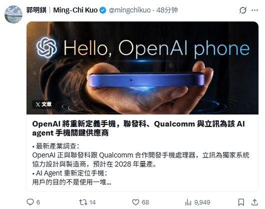 郭明錤:OpenAI联手高通&联发科开发手机芯片,自研手机项目预计2028年量产
