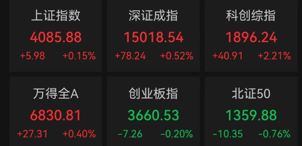 今天上午,A股走势分化,上证指数上涨0.15%,深证成指上涨0.52%,创业板指下跌0.2%,科创综指上涨2.21%。