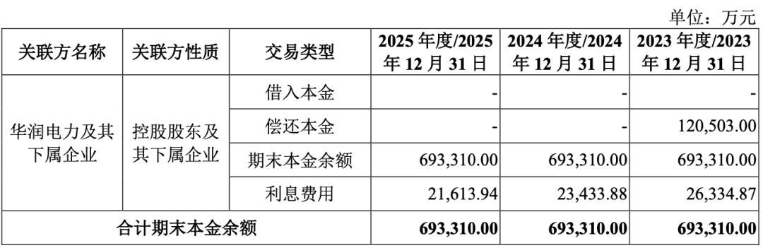 报告期各期末,华润新能源合并资产负债率分别为 54.80%、57.50% 和 59.98%。公司处于资本密集型行业,固定资产投资规模较大,其中债务资金主要来自于 银行 贷款。截至 2025 年末,华润新能源负债合计 1411.12 亿元,短期借款就达 124.23 亿元。