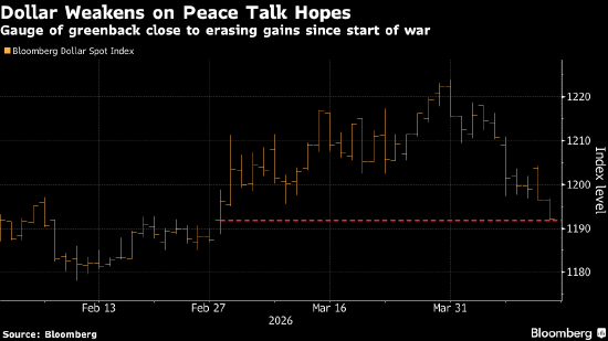 美元现货指数周二下跌0.4%,跌至3月2日、也就是中东冲突爆发初期以来的最低水平。目前美国和伊朗正考虑再举行新一轮和平谈判,这令全球股市乐观情绪升温,并推动油价下跌。