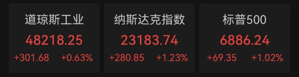 当地时间4月13日,美国三大股指全线收涨。Wind数据显示,截至收盘,道指涨0.63%,报48218.25点;标普500指数涨1.02%,报6886.24点;纳指涨1.23%,报23183.74点。