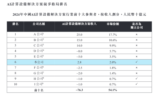 根据弗若斯特沙利文的资料,按2024年收入计,安擎为中国 第六大 AI计算设备解决方案提供商,占 2.0% 的中国市场份额。