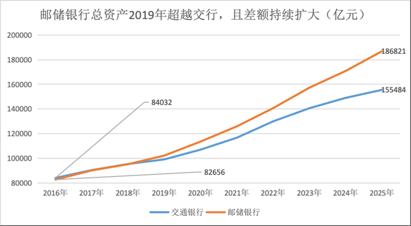 财报数据显示,截至2025年末邮储银行总资产18.7万亿元,高出交通银行3万多亿元。如分时段来看,邮储银行资产规模和交通银行差距拉大主要在2022-2025年。