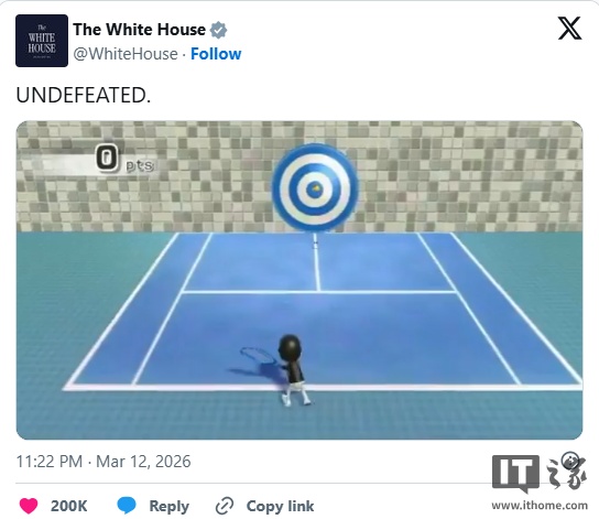 IT之家 4 月 19 日消息,在当地时间 4 月 17 日召开的美国众议院外交委员会会议上,日本外相茂木敏充就美国白宫近日在其官方 X 账号发布的一段视频提出批评,该视频将美国对伊朗近期军事行动的画面与任天堂 Wii 游戏机的启动画面及《Wii 运动》游戏片段混剪在一起。
