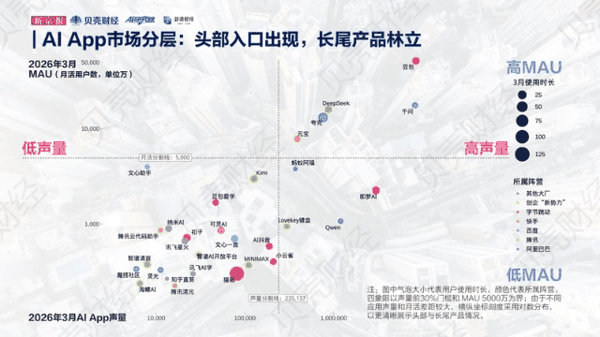 新京报 贝壳 财经记者梳理2026年3月的中国 AI应用 声量与月活数据发现,中国AI应用的头部梯队已经初步形成——豆包、千问、DeepSeek、夸克、元宝五款产品在两项指标上都明显领先于其他应用。